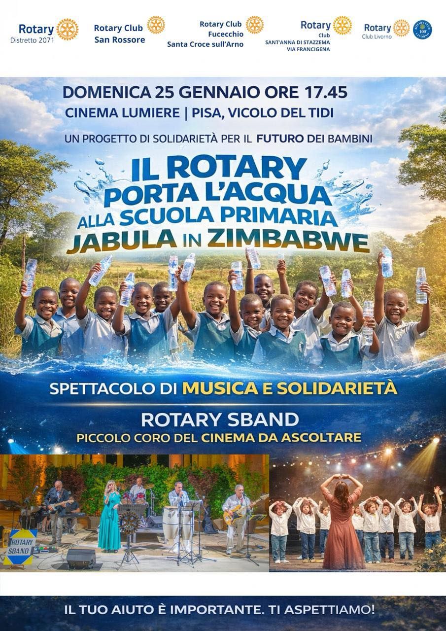 Nel pomeriggio di domenica 25 gennaio 2026 al cinema LUMIERE dii Pisa la SBAND del Rotary club di Fucecchio Santa Croce sull’Arno ed il Piccolo Coro del Cinema da Ascoltare si sono esibiti in un concerto a sostegno del Global Grant "JABULA PRIMARY SCHOOL, WATER AND SANITATION PROJECT" . L’evento è stato organizzato dai Rotary club di Fucecchio Santa Croce sull’Arno, di San Rossore, di Sant’Anna di Stazzema via Francigena e di Livorno, a sostegno del Global Grant "JABULA PRIMARY SCHOOL, WATER AND SANITATION PROJECT" che ha l'intento di fornire un aiuto concreto alla scuola primaria di Ja...